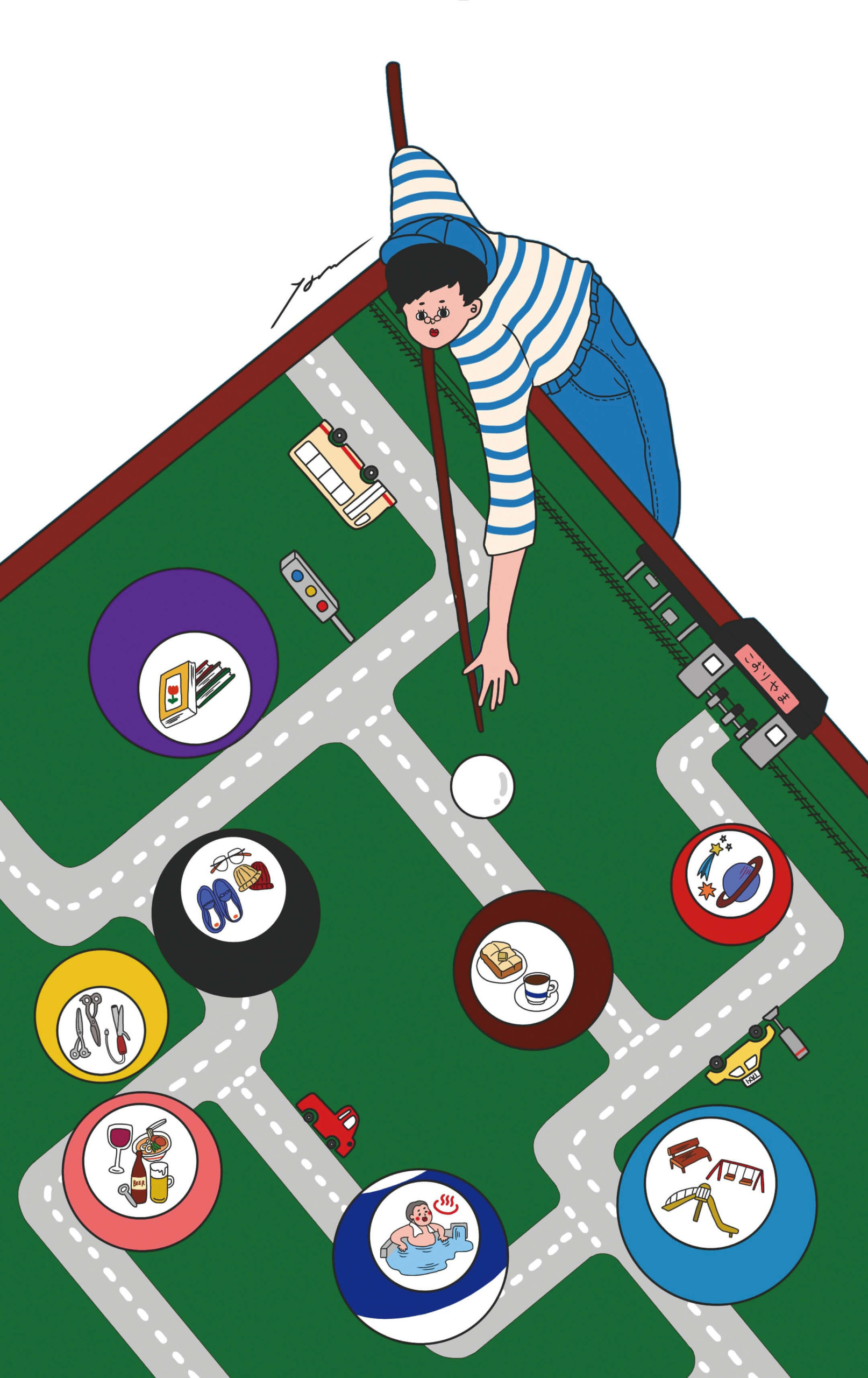 単なる地域ガイドではなく「店主・小川さんの生活圏の記録」として再定義しました。アメコミ風の吹き出しやビリヤードの玉をモチーフにしたポップなイラストを採用し、「何だろう?」と思わず手に取ってしまう「かわいさ・オシャレさ」をファーストインプレッションに設定。 「急がず、1日2軒くらいがちょうどいい」という週末の過ごし方を提案し、ステッカーを「街をめぐるための小さな切符」として機能させることで、直感的な共感から実際の街歩きへとつなげる動線を設計しました。