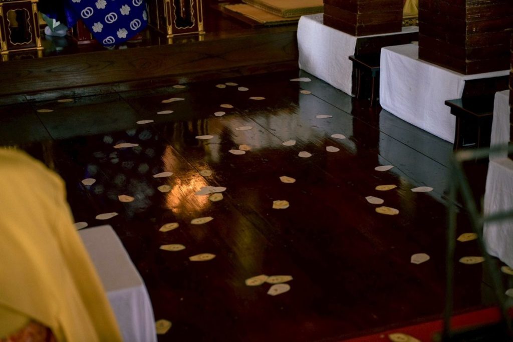 法要がすべて終わり、張り詰めていた空気がふっと和らぐ瞬間。 ご本尊に供えられていた「お布施(おひねりのようなもの)」が撒かれ、参加者たちがそれを笑顔で拾い集めます。自分ひとりの願いだけでなく、その場にいる有縁無縁のすべての人と、ご利益を分かち合う。飯坂という街の思いやりの文化が凝縮された、美しく心温まるフィナーレでした。