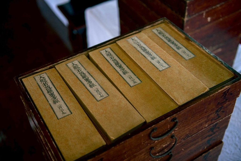本堂に足を踏み入れると、まず目に飛び込んでくるのは、積み上げられた膨大な経典。仏教の知恵が凝縮された全600巻の「大般若経」です。