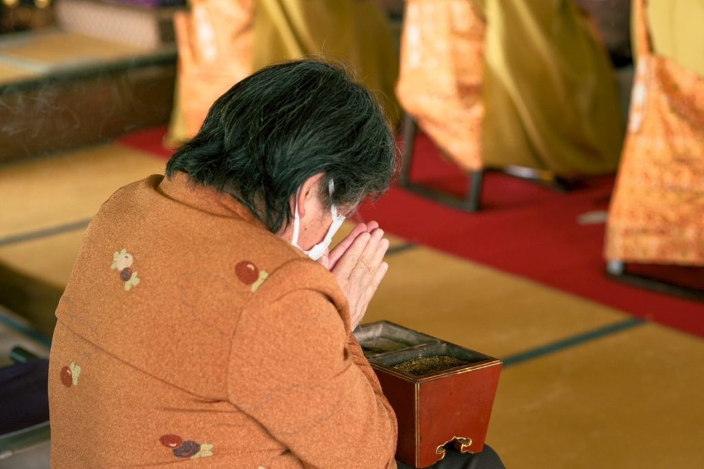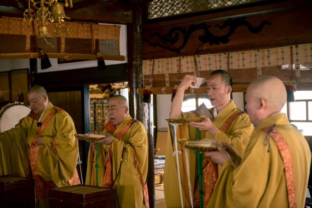 僧侶たちが一斉に経典をめくる音。 空間を引き締めるように響く、法具の澄んだ調べ。 そして、参加者も一緒に手元の教本を開き、唱える「般若心経(はんにゃしんぎょう)」の声。